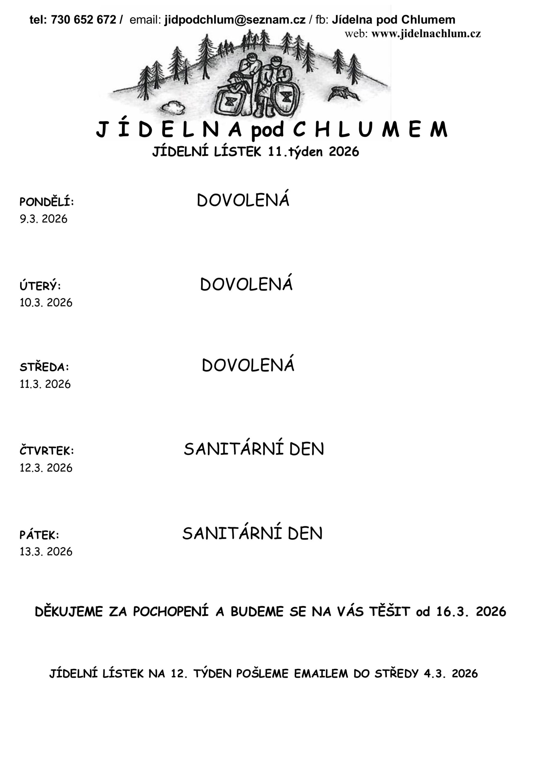 Další týden od 9.3. do 13.3. máme zavřeno, děkujeme za pochopení.
